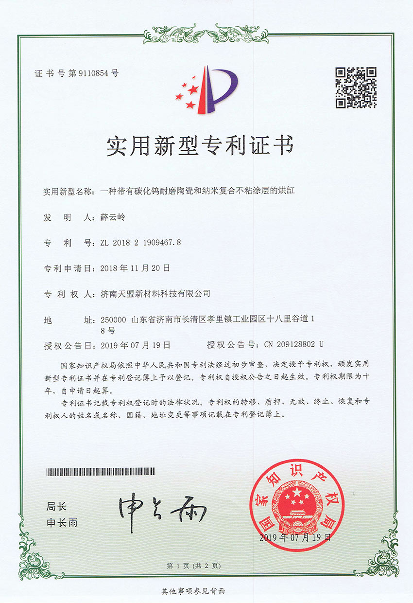 • 一種帶有碳化鎢耐磨陶瓷和納米複合不粘塗層的烘缸